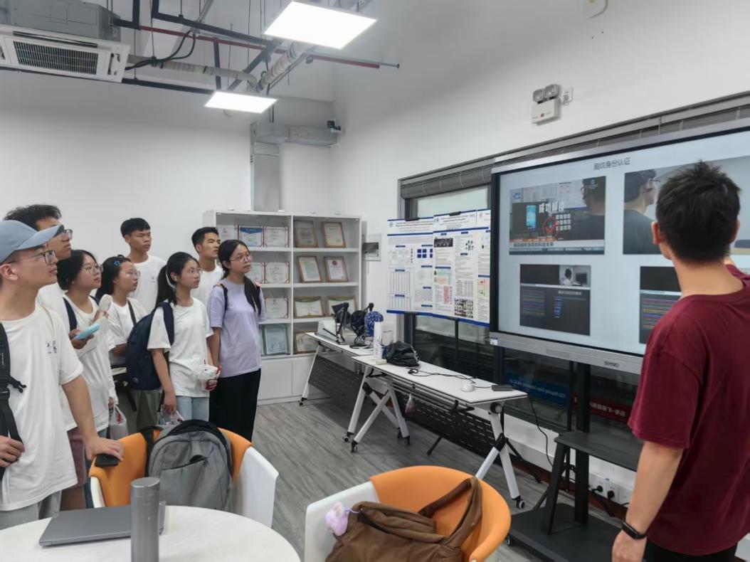 图2, 展示了我校研究生向营员详细讲解“脑纹身份认证系统”的核心原理。演示者通过实时脑电采集设备,向学生展示个体在执行特定认知任务(如想象运动、观看特定图像)时,大脑会产生独特且稳定的脑电波模式,即“脑纹”。该系统利用这种生物特征进行身份识别,具有难以伪造、活体检测等安全优势。该环节旨在揭示脑科学与信息安全交叉领域的前沿应用。